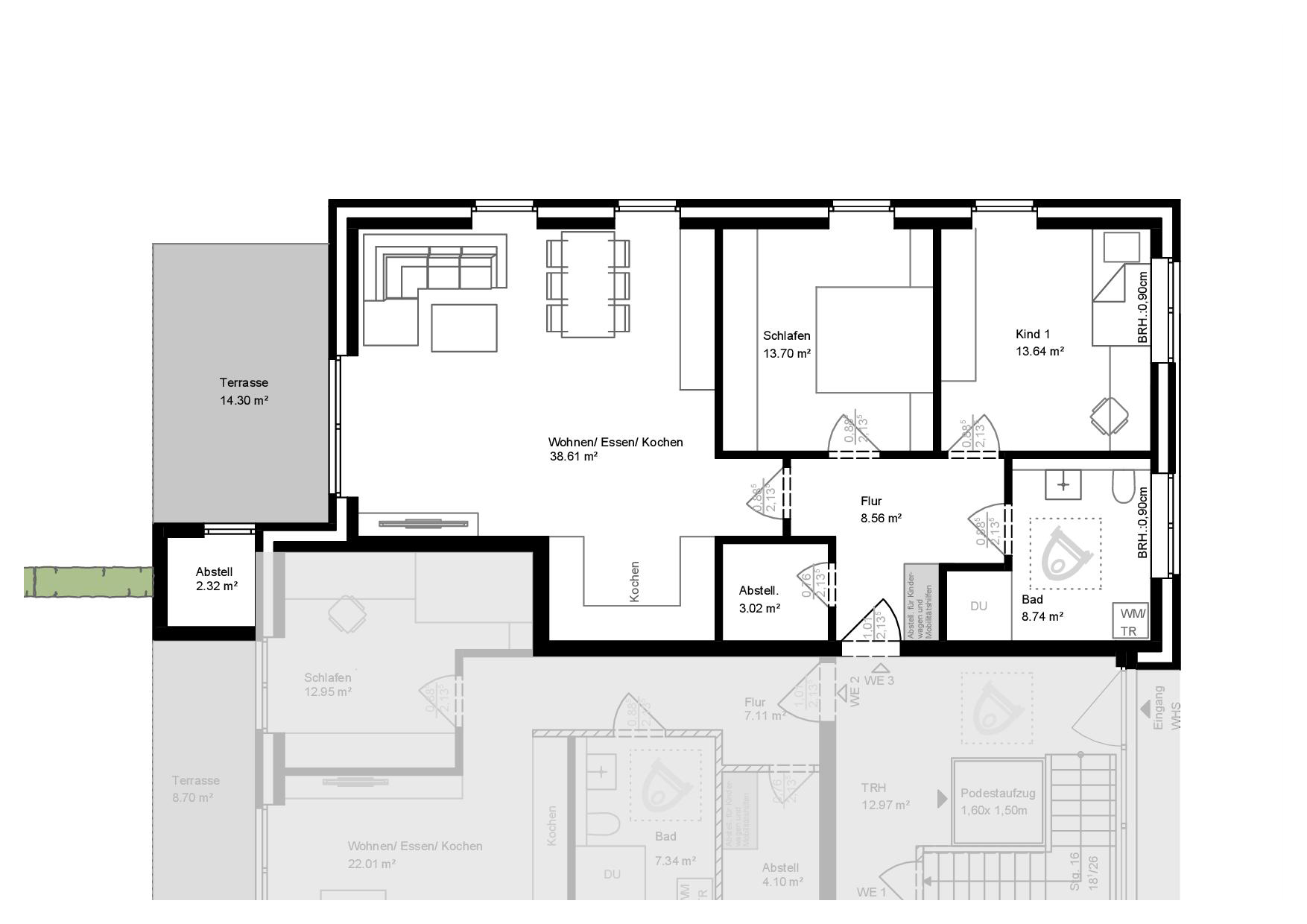 89,51 m², 3-Zimmer-Wohnung, Tageslichtbad, Terrasse mit angrenzendem Abstellraum, Garten, inkl. 1 PKW-Stellplatz